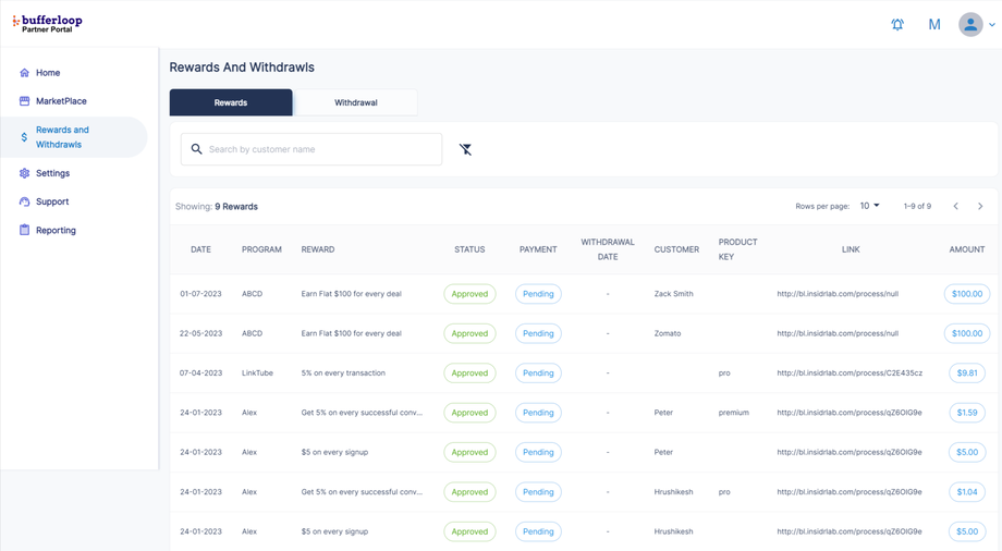 Once partner joined any program they get tracking/referral links, they can submit leads(which are possible customers) and they can register a deal and work on that to close successfully. If partner brings any customer for their program then bufferloop system generates rewards for partner as setup by vendor.