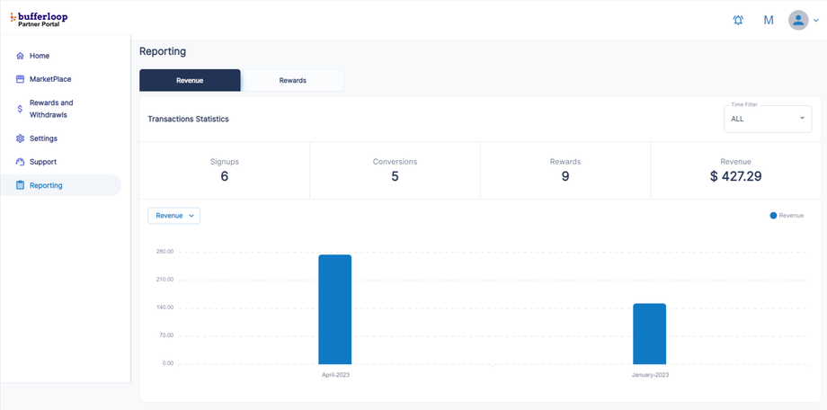 In the reporting section, partner can have in depth details of revenue/transaction reports and reward reports.