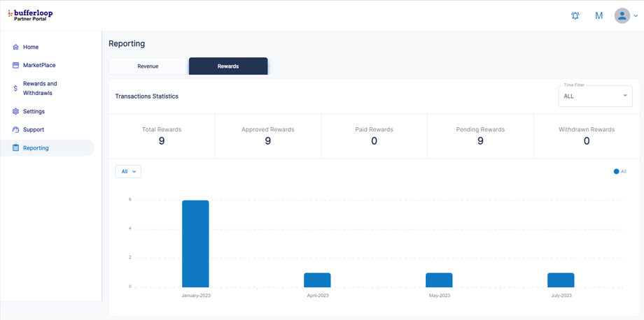 1) Partner can see all the reward reports with quick stats, graphical representation and table of reward summary.