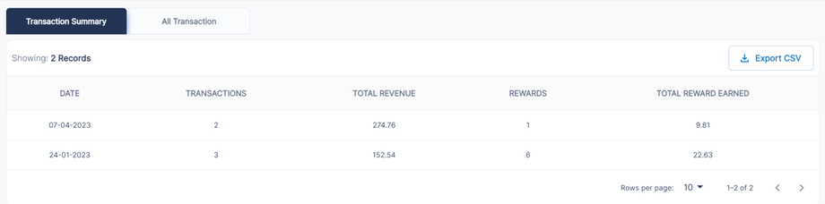 4) In the transaction summry -> you get the data of how many transactions, revenue and rewards are generated for that day.