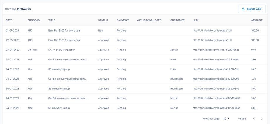 4) In the reward summary -> You get the data of every reward generated for you. Here you can see the date of the reward is generated and its reward title, program, status, payment, withdrawal date, customer, link, reward amount.