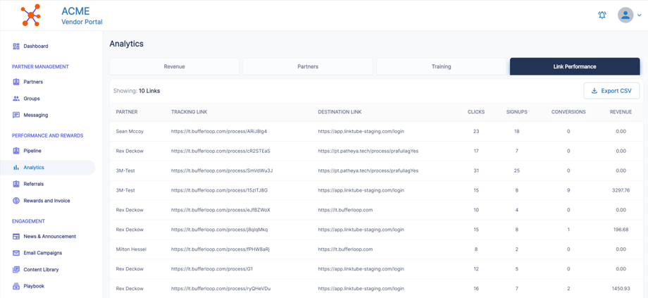 List of tracking link assigned to partner with their performance you can export this list into csv format.