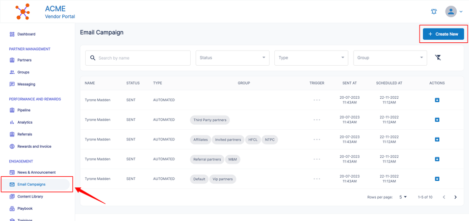 If you want to send an email after some event or goal is achived then you can use automated email campaigns. This type works on triggers. Like if some partner has joined your program then you can trigger an welcome email to the partner.