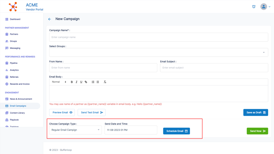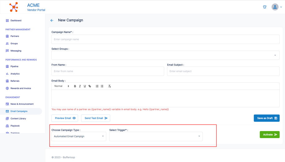 - Email body -> Here you can use variable {{partner_name}} to dynamically display each partner name.