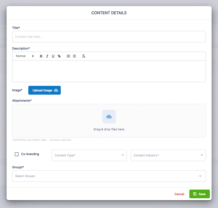 Attachment -> Upload Files which will be available for partners to downlaod. eg. pdf, doc, png, jpg